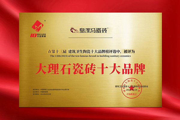 皇家马瓷砖通过了中国强制性3C产品认证、ISO9001质量管理体系认证、并入选中国建筑卫生陶瓷十大品牌榜、大理石瓷砖十大品牌,享誉全国。